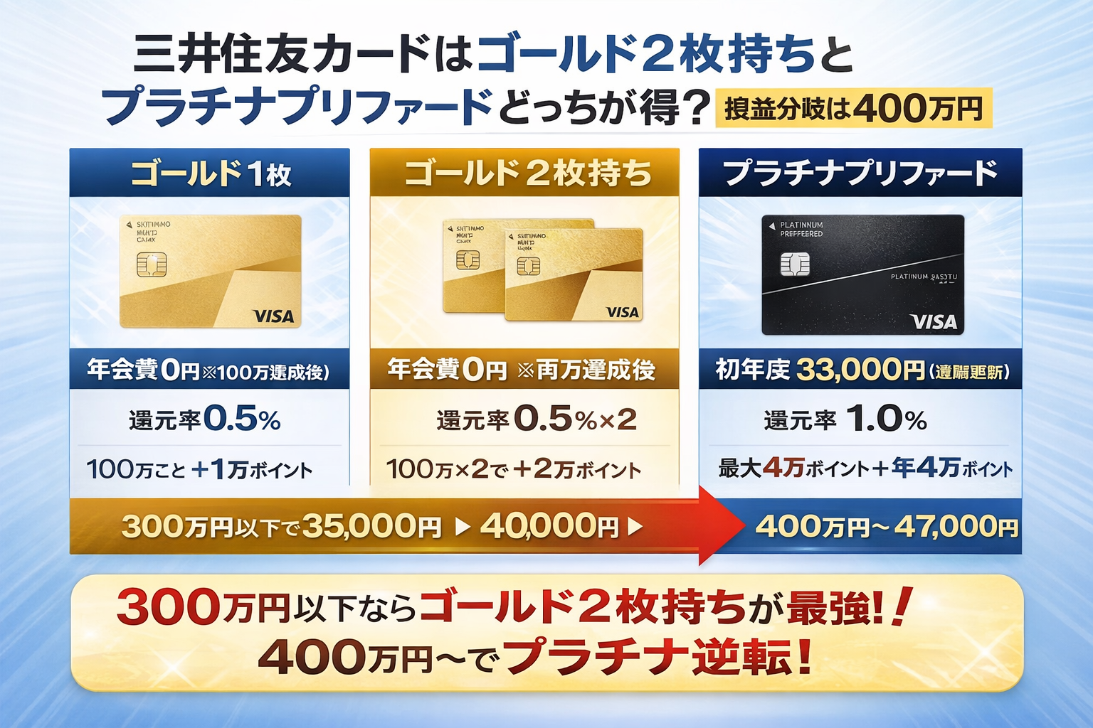 「三井住友カードのゴールド(NL)を2枚持ちするのと、プラチナプリファードにするのってどっちが得?」